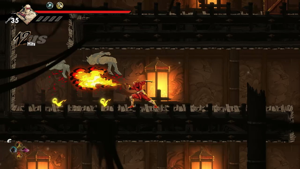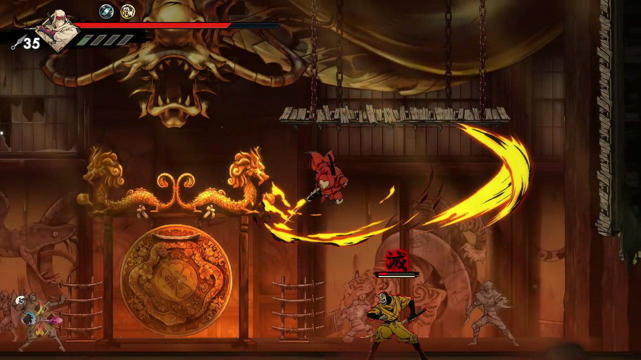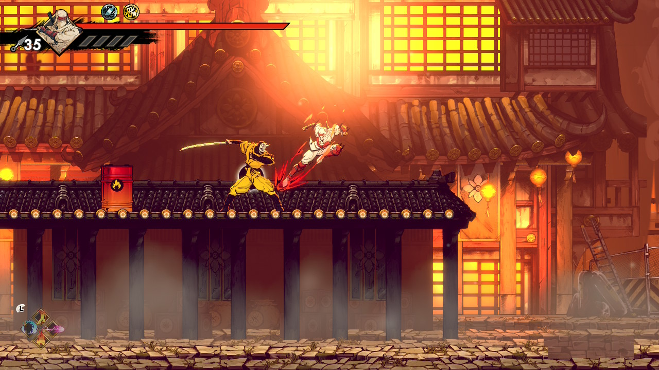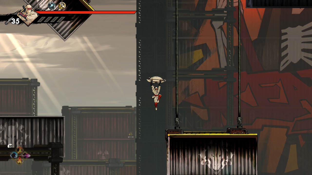 The game encourages revisiting previous stages with new abilities. A platform unreachable even with double jump becomes accessible once you acquire the Glide upgrade, and later the Grapple Hook adds even more vertical reach. The hook allows Musashi to latch onto fixed grapple points, swing across gaps, and chain movements that would be impossible otherwise. With both Glide and Grapple available, backtracking becomes faster, more expressive, and better aligned with the metroidvania loop of unlocking old spaces through newly earned mobility.