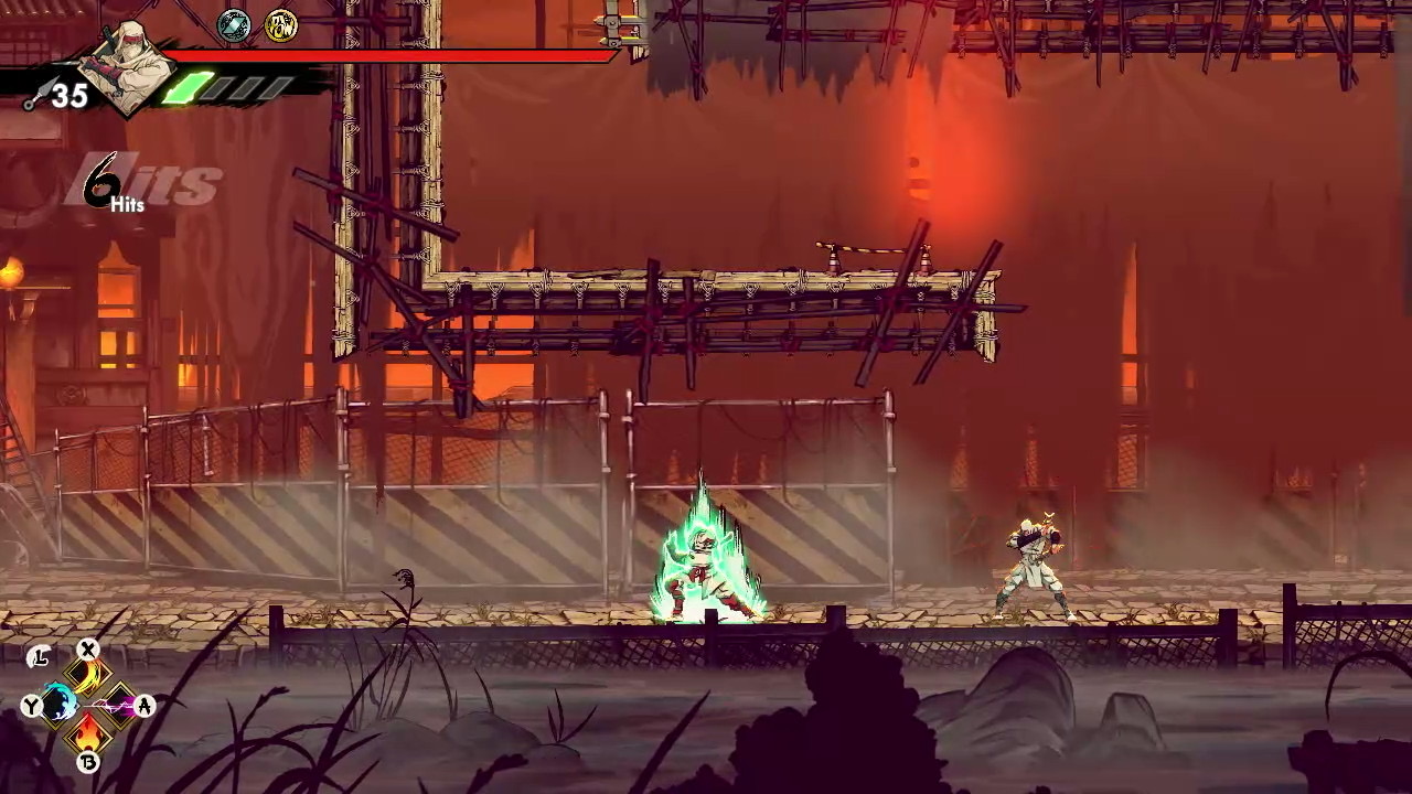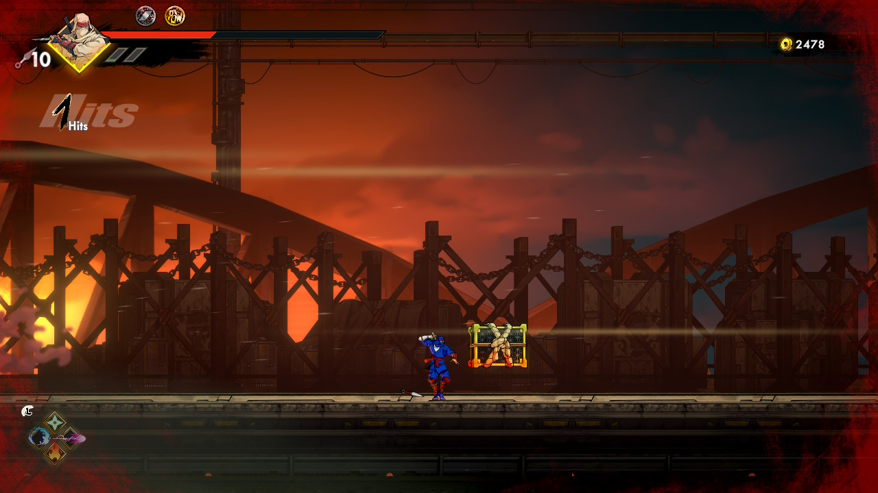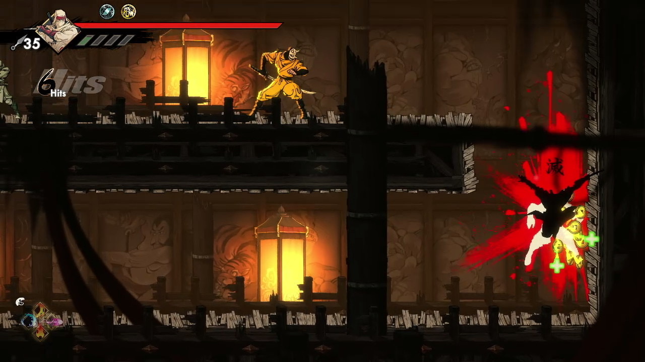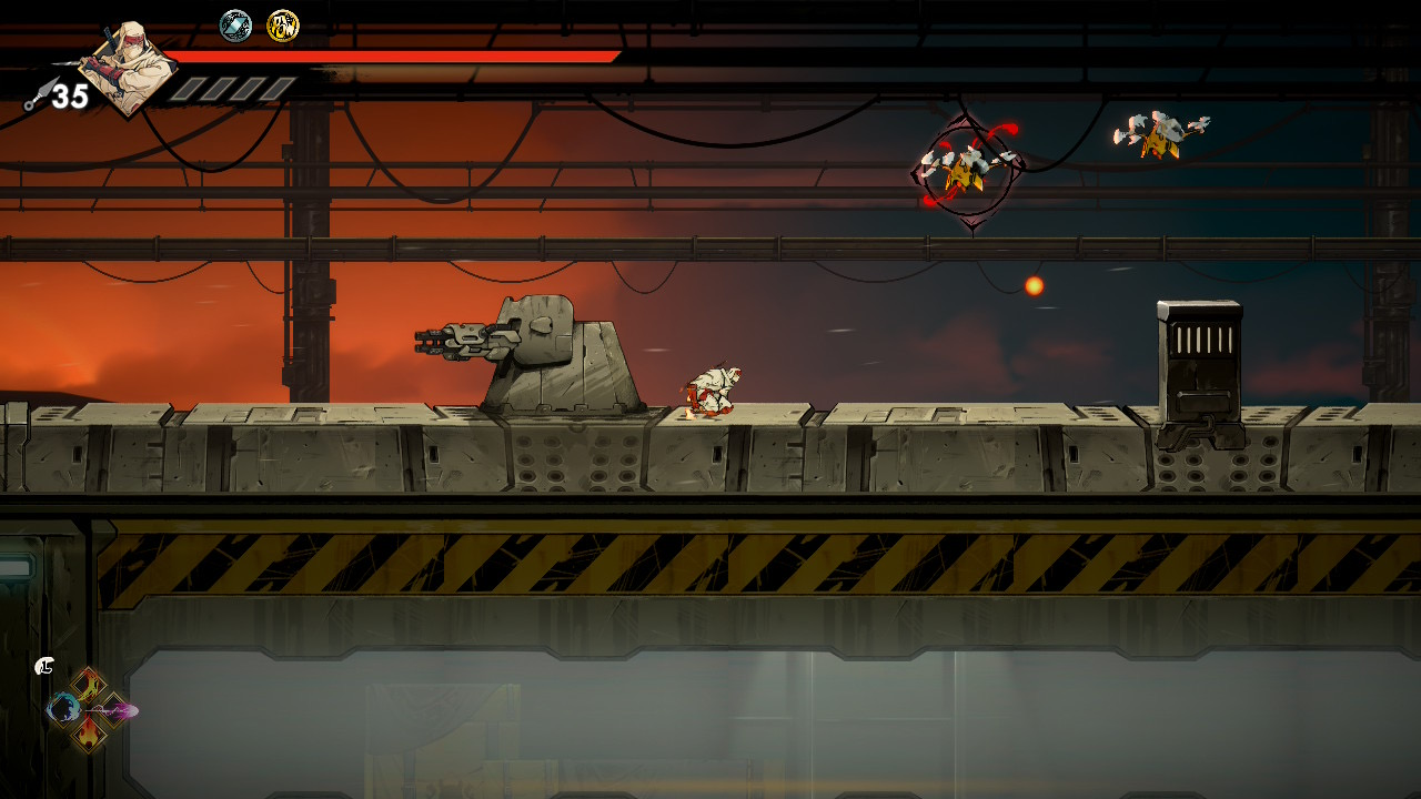 The game encourages revisiting previous stages with new abilities. A platform unreachable even with double jump becomes accessible once you acquire the Glide upgrade, and later the Grapple Hook adds even more vertical reach. The hook allows Musashi to latch onto fixed grapple points, swing across gaps, and chain movements that would be impossible otherwise. With both Glide and Grapple available, backtracking becomes faster, more expressive, and better aligned with the metroidvania loop of unlocking old spaces through newly earned mobility.